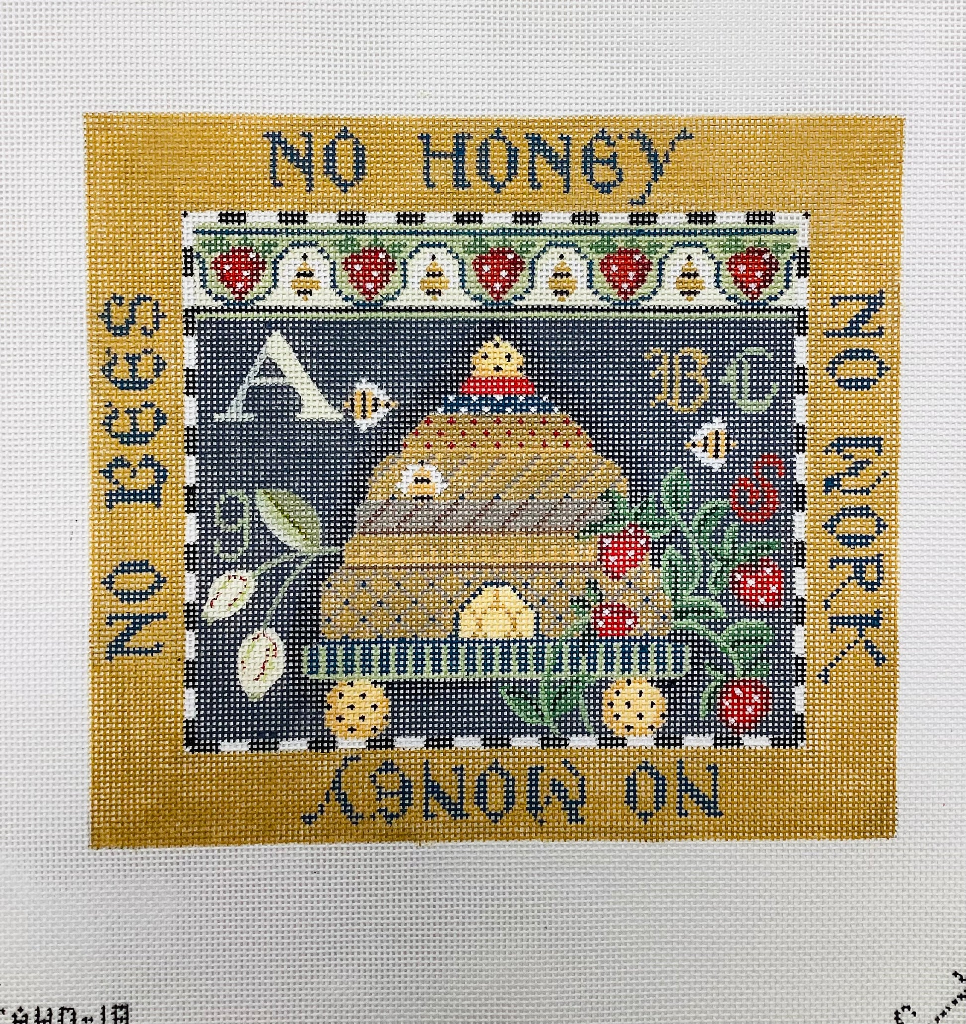 7" x 8" design on 18 mesh needlepoint canvas. No bees, No honey, No Money, No work.
