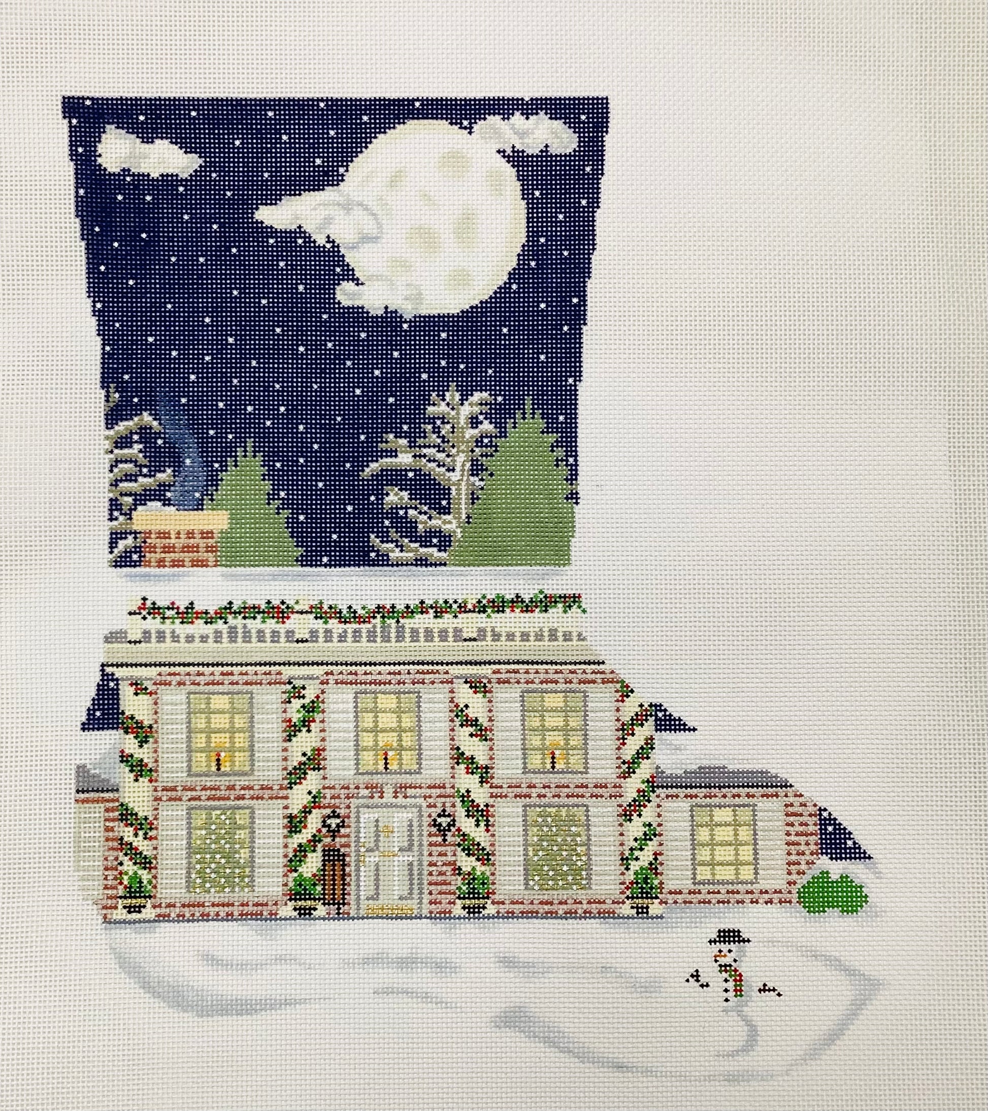 Capture your holiday memories with this warm and cozy house design on a needlepoint stocking. 13 x 18 inch design, with room for personalization, on13 mesh needlepoint canvas.