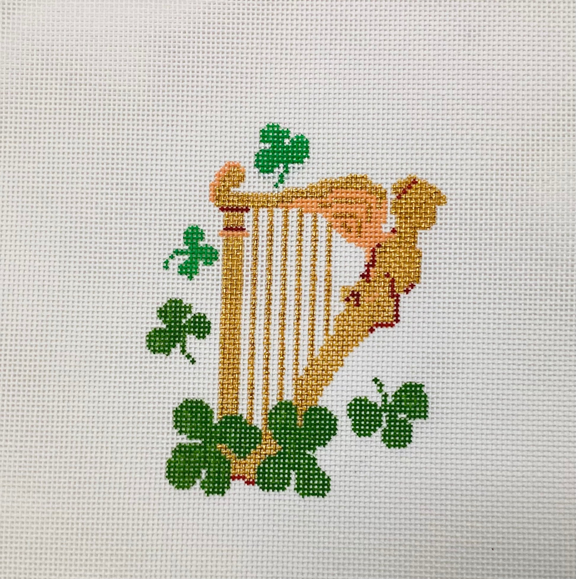 4.25" x 4" design on 18 mesh needlepoint canvas. The luck of the Irish goes with the Irish harp music.
