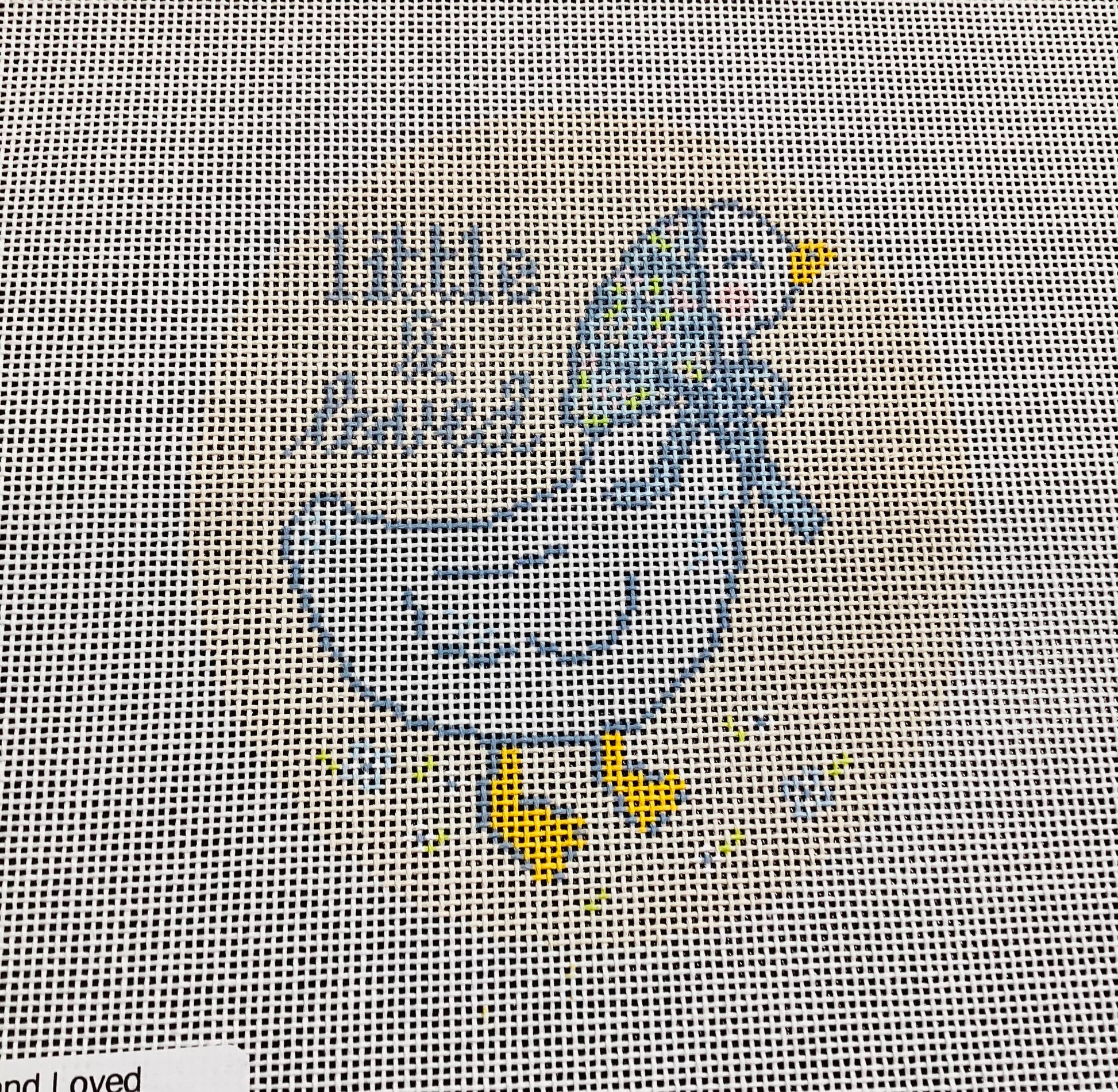 4.5" round design on 18 mesh needlepoint canvas. This sweet ducking is pastel, little and loved.