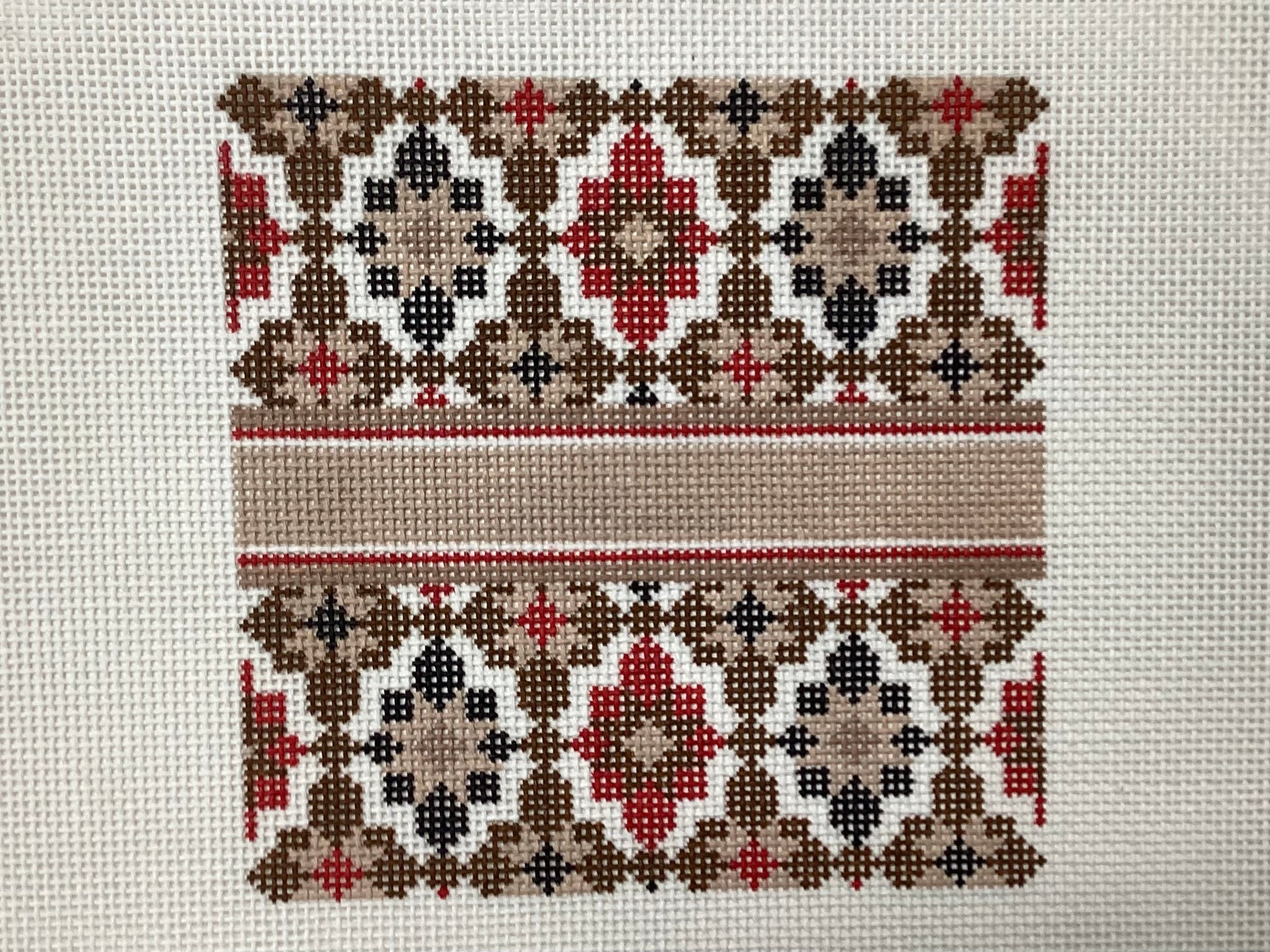4.25 inch square design on 18 mesh needlepoint canvas. Perfect as insert or on its own.